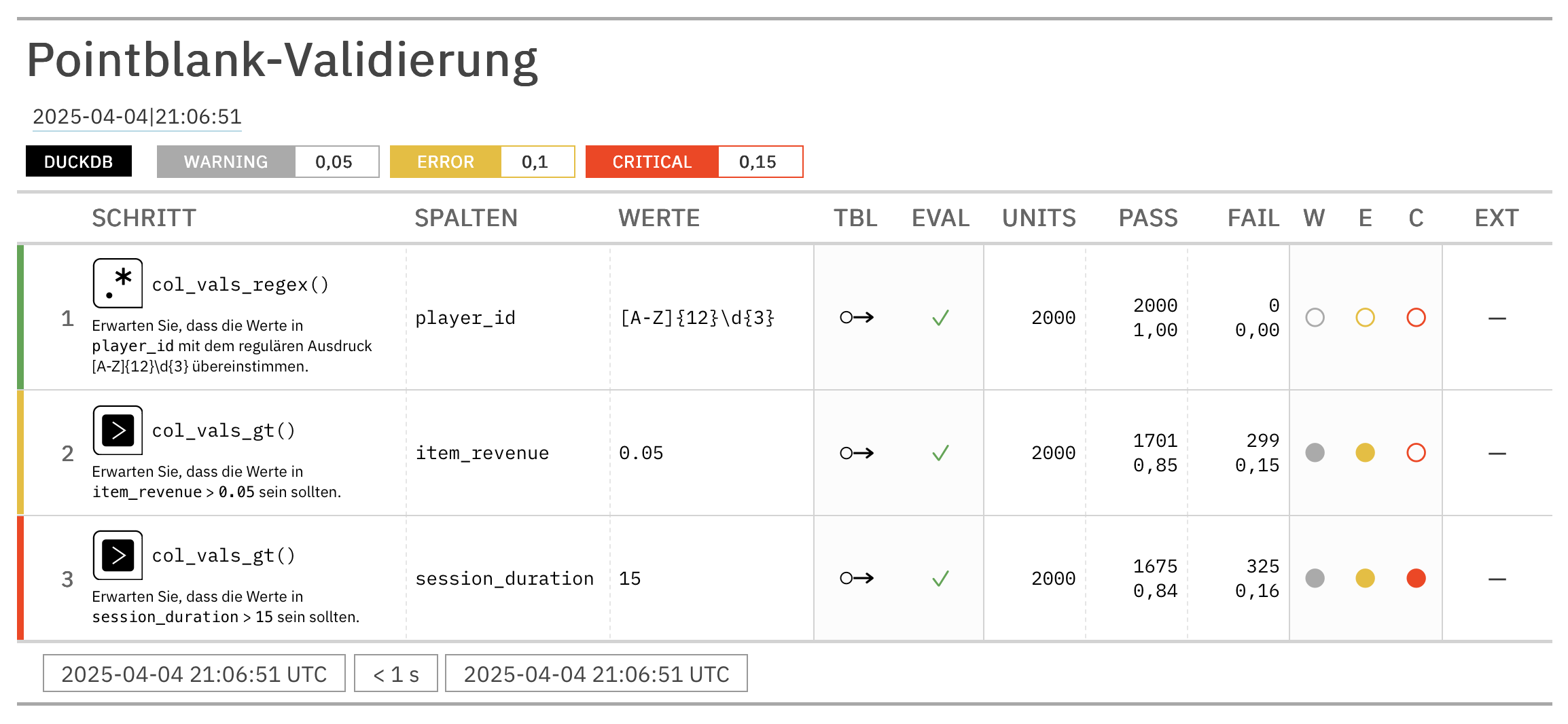 What sets Pointblank apart is its intuitive, expressive approach to data validation. Rather than writing dozens of ad-hoc checks scattered throughout your codebase, Pointblank lets you define a comprehensive validation plan with just a few lines of code. The fluent API makes your validation intentions crystal clear, whether you’re ensuring numeric values fall within expected ranges, text fields match specific patterns, or relationships between columns remain consistent.