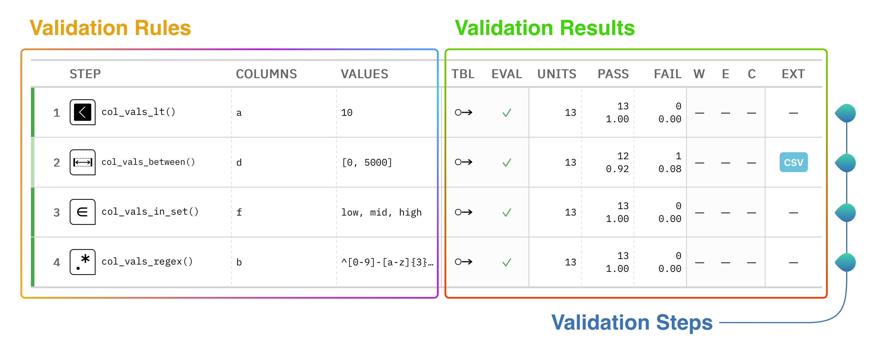 Now, onto the result: it’s a table! Naturally, we’re using the awesome Great Tables package here in Pointblank to really give you the goods on how the validation went down. Each row in this reporting table represents a single validation step (one for each invocation of a col_vals_*() validation method). Generally speaking, the left side of the validation report tables outlines the key validation rules, and the right side provides the results of each validation step.