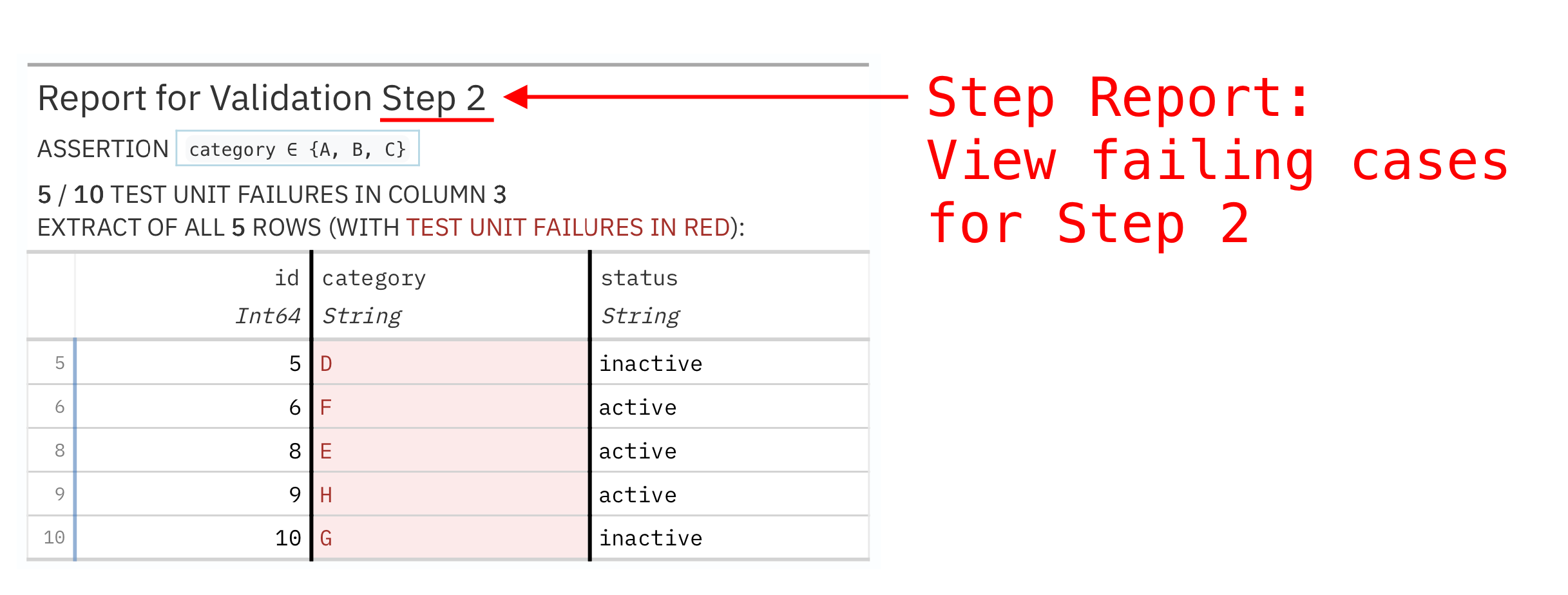 Notice the arrow pointing to ‘Step 2’ in the title. Failing values are highlighted in red. Once we know we have failures, it’s important to take action and discover why data is failing. Looking at failing cases in step reports often uncovers obvious causes behind failures.