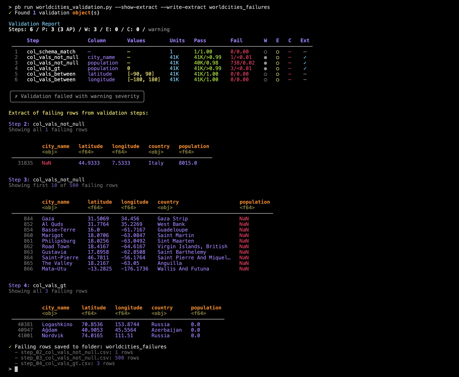 This shows a preview of each extract for those validation steps where extracts were produced (steps 2, 3, and 4). Individual CSV files with extracted rows for those steps were written to the worldcities_failures directory.