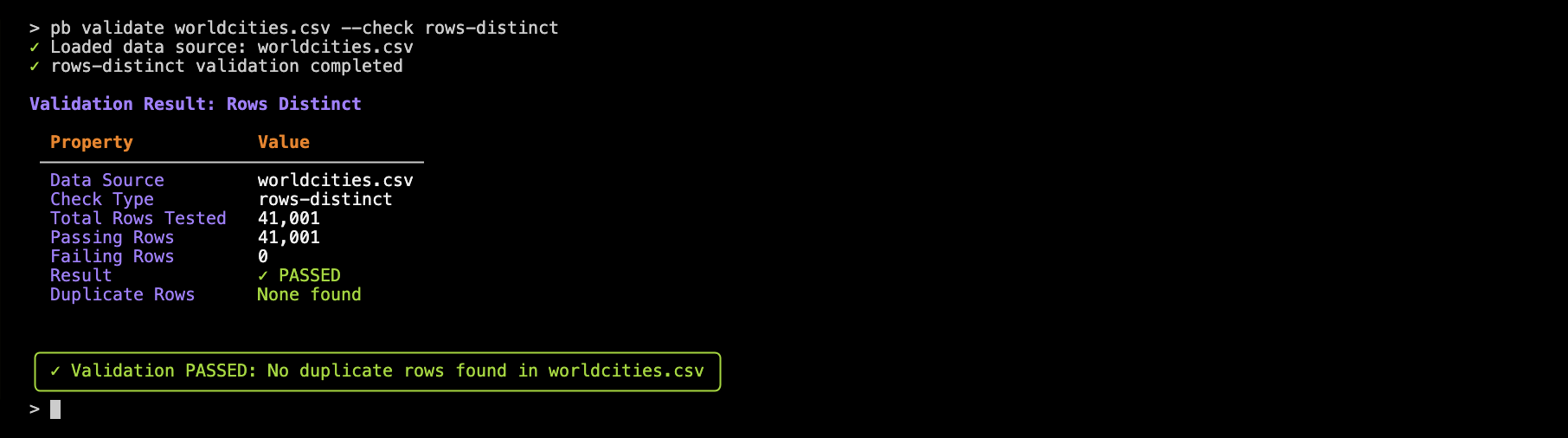 pb validate worldcities.csv --check rows-distinct