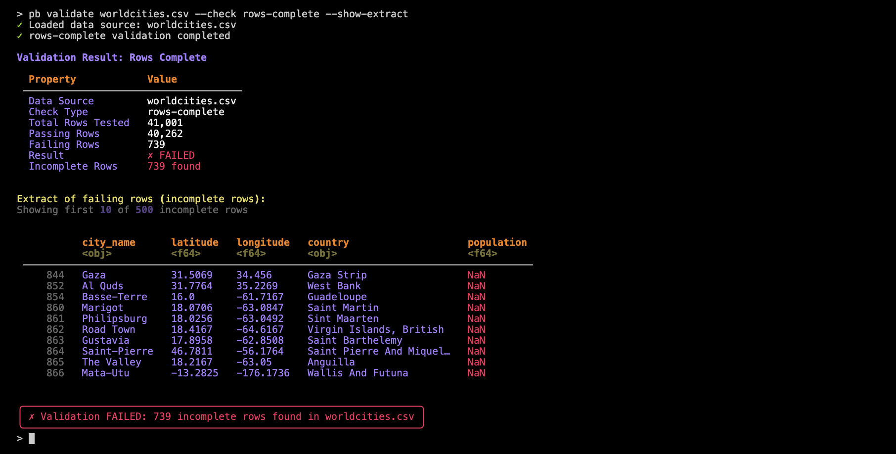 pb validate worldcities.csv --check rows-complete --show-extract